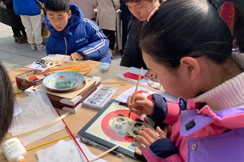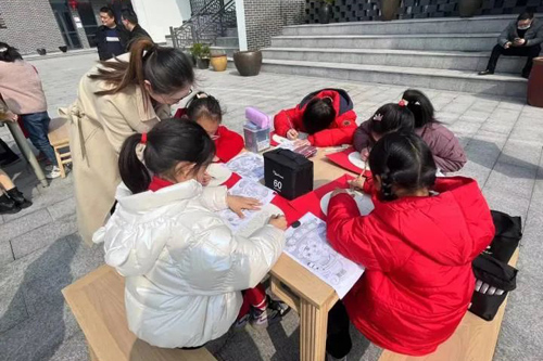 难得的晴天,久违的阳光驱赶寒冷,让人暖意融融。原本的活动场地也从室内搬到了室外。下午1时许,万安庄村文化礼堂外已是十分热闹。“花灯铺”“漫画铺”“黏土铺”,还有创意民俗“麦秆画铺”都一一排开,20多个孩子围桌而坐,专心致志搞起创作来。