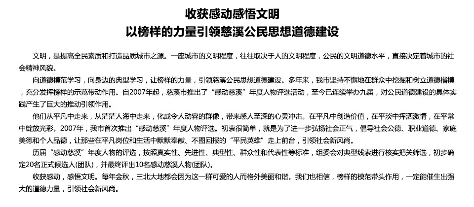 把典型人物的“模范作用”贯穿评选全过程,结合“发现最美浙江人,争做最美浙江人”和“中国好人榜”、“宁波好人”评选等活动,大力倡导“守规则、重礼仪、...